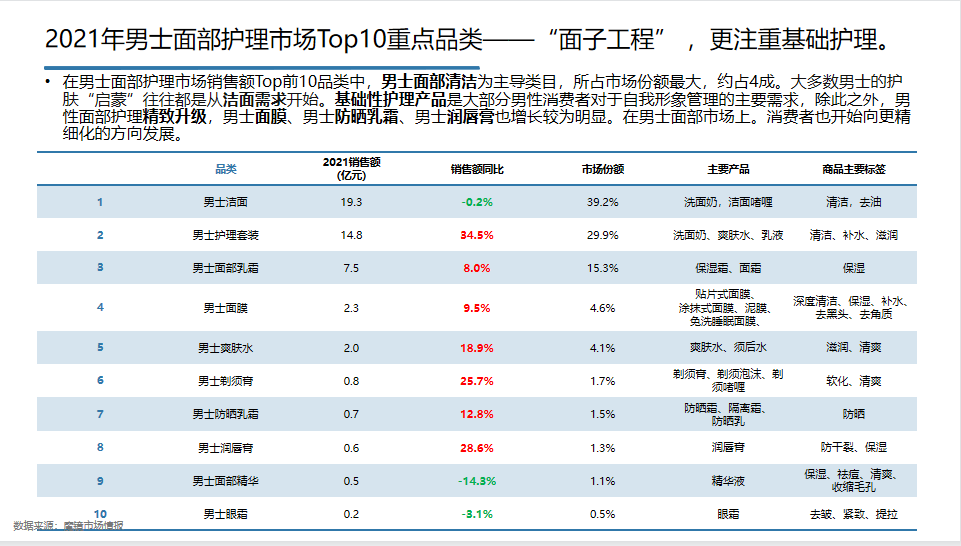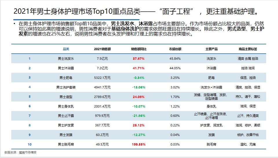 在这篇文章里,魔镜将从男士市场规模、重点品类和品牌、热卖产品三方面对其进行研究,带你一起探究男性洗护市场的新趋势及突破点。