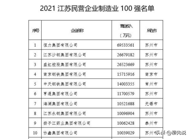 江苏是名副其实的“制造大省”,近些年全力打造新型电力和新能源装备、工程机械和农业机械、物联网、高端新材料等6个综合实力国际领先或国际先进的先进制造业集群,培育了新型集成电路与新型显示、新能源汽车、高端装备、高技术船舶和海工装备等10个综合实力国内领先的先进制造业集群。下面根据江苏省工商联此前发布的江苏民营企业制造业百强名单,简单来盘点一下排名靠前的“江苏制造”。