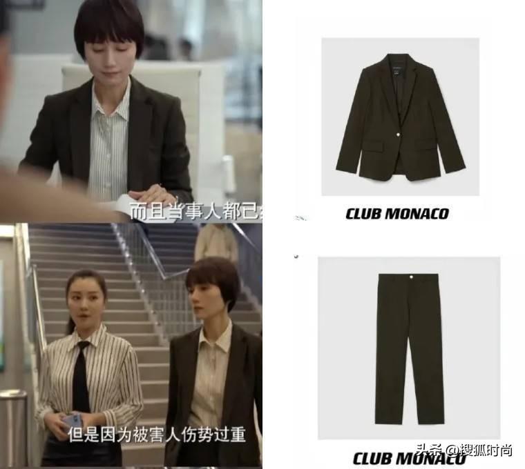 轻奢品牌Club Monaco也是白领们的通勤,袁泉在剧中也Get了黑橄榄色的西服套装,内搭条纹衬衫,职业装搭配的也不会很刻板,透出些许休闲元素。