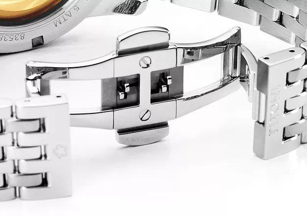该款梅花表的整体设计偏经典商务风,和天梭力洛克有着几分的相似,同样有着复古的罗马大三针和精细的抛丝精钢表带。不过,我个人会更喜欢梅花的背透设计,天梭力洛克的半镂空设计略显拘谨,而这款梅花表采用全透底底盖设计搭配装饰性自动机芯,雕刻着梅花LOGO的金色摆陀极具奢华质感。