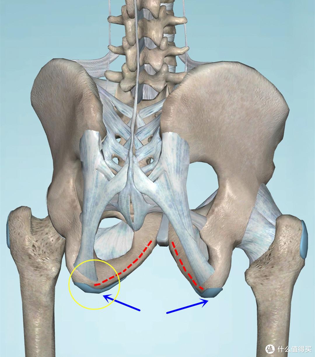 骨盆后侧视图黄色圈出的是坐骨结节,蓝色箭头标注的是坐骨结节滑囊,在坐骨结节下方,起到润滑保护作用。红色虚线部分是坐骨支和耻骨下支,这块骨骼在我们坐下的时候可以用手摸出来,一个上高下低、上窄下宽的“八”字形结构。