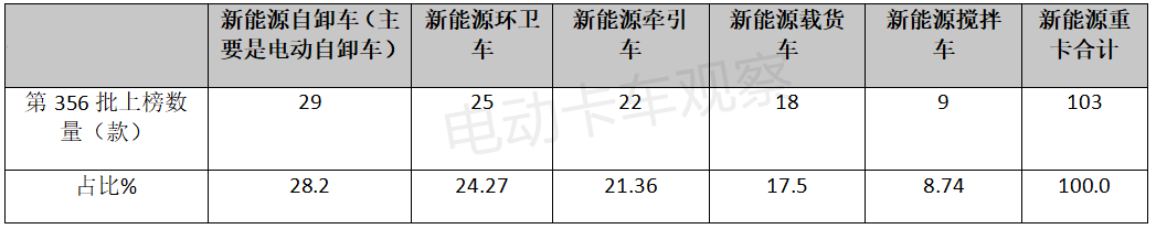 根据工信部数据,第356批新能源重卡公告中上榜的各类车型数量及环比、占比情况如下: