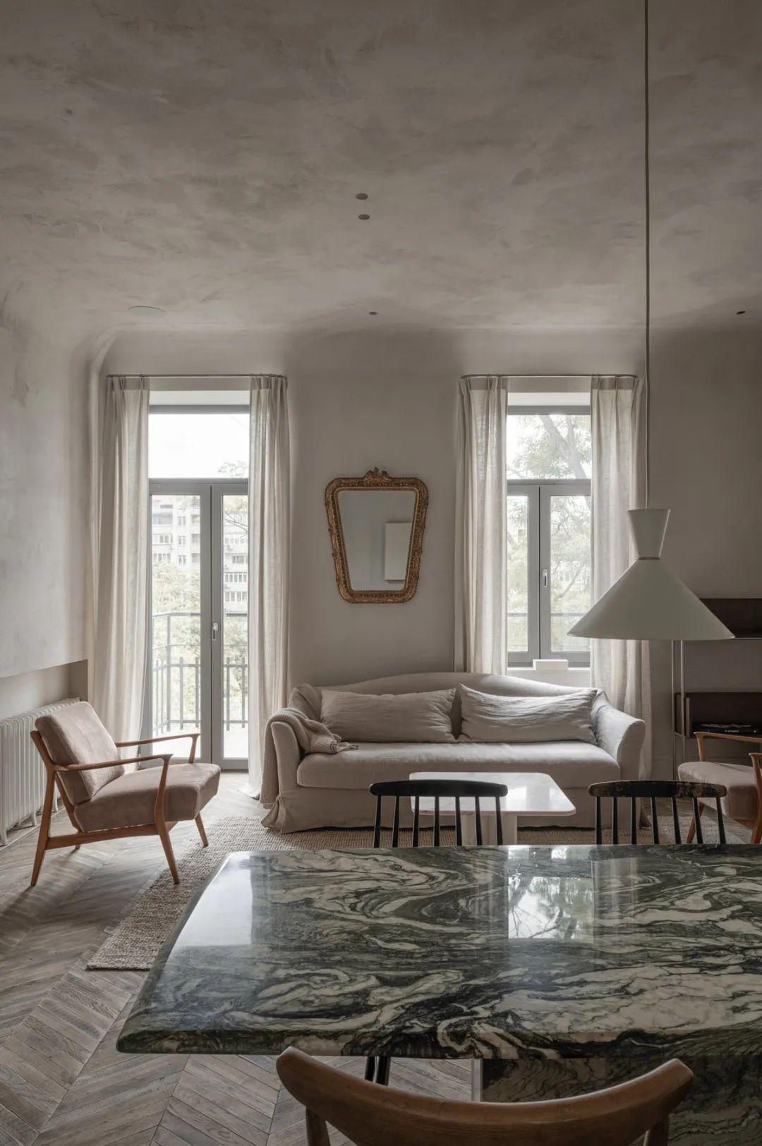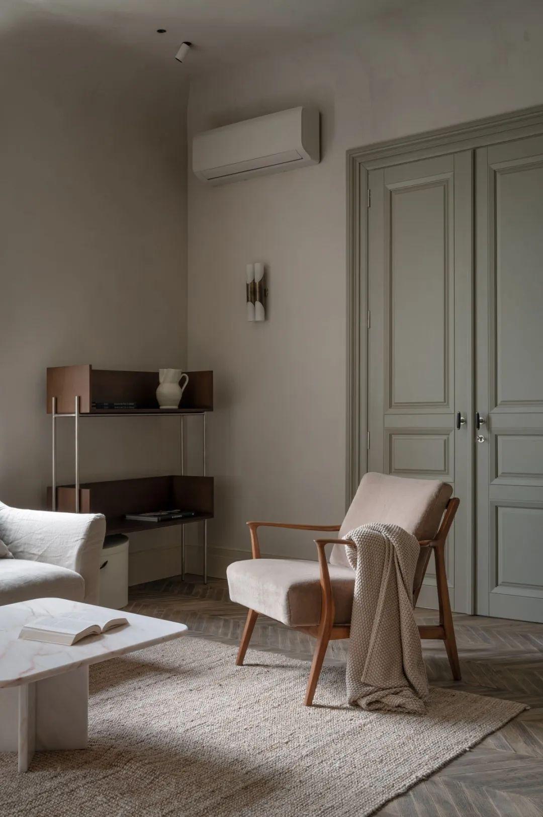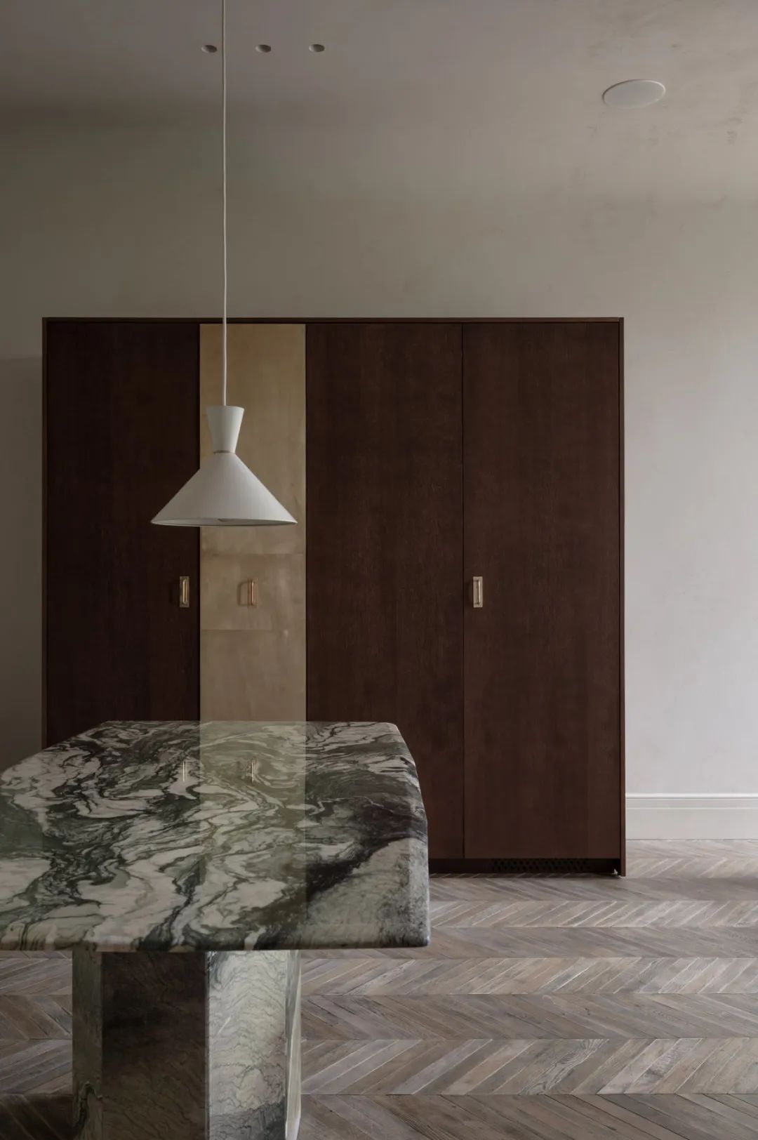古旧的橡木地板由团队修复,在公寓里以人字形图案组装,披予了时间光泽的斑驳痕迹,于枯寂中而显风雅。