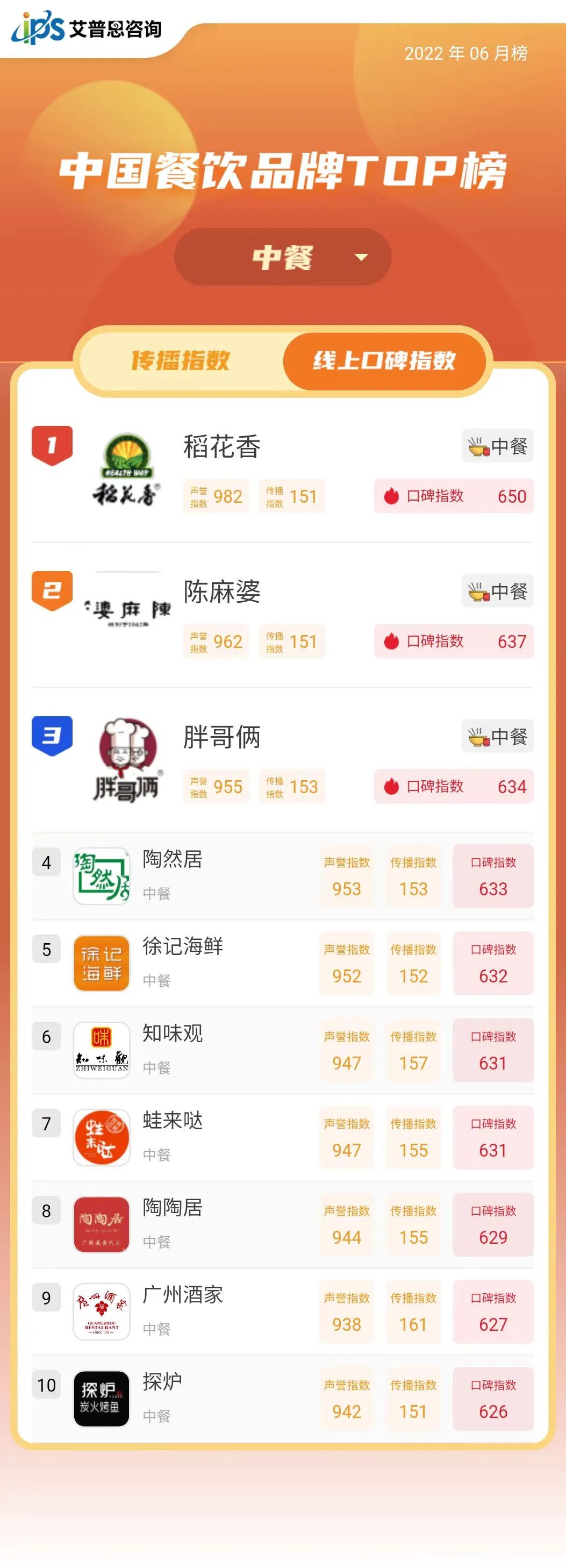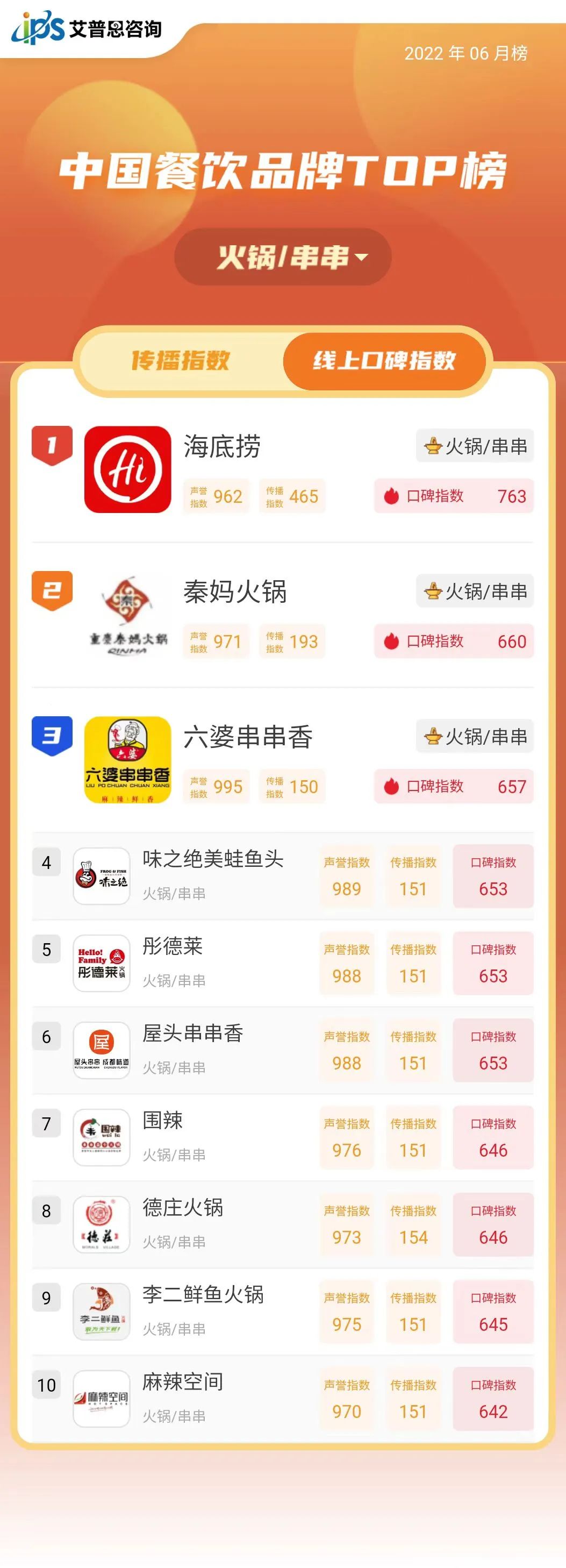 线上口碑指数排名前三的火锅/串串品牌为:海底捞、秦妈火锅、六婆串串香;线上口碑指数排名前三的中餐品牌为:稻花香、陈麻婆、胖哥俩; 线上口碑指数排名前三的小吃/快餐品牌为:肯德基、华莱士、麦当劳。