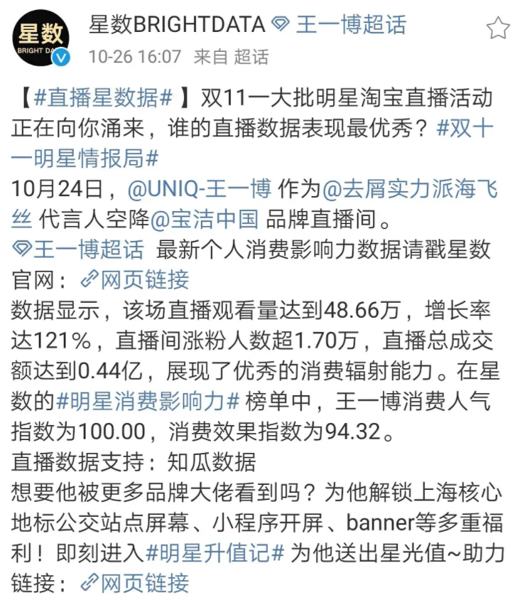 事实上,海飞丝冲到榜首可不是意外黑马。10月24日,王一博作为海飞丝品牌的代言人参与直播,创造了48.66万的观看量,带来了0.44亿的成交额。
