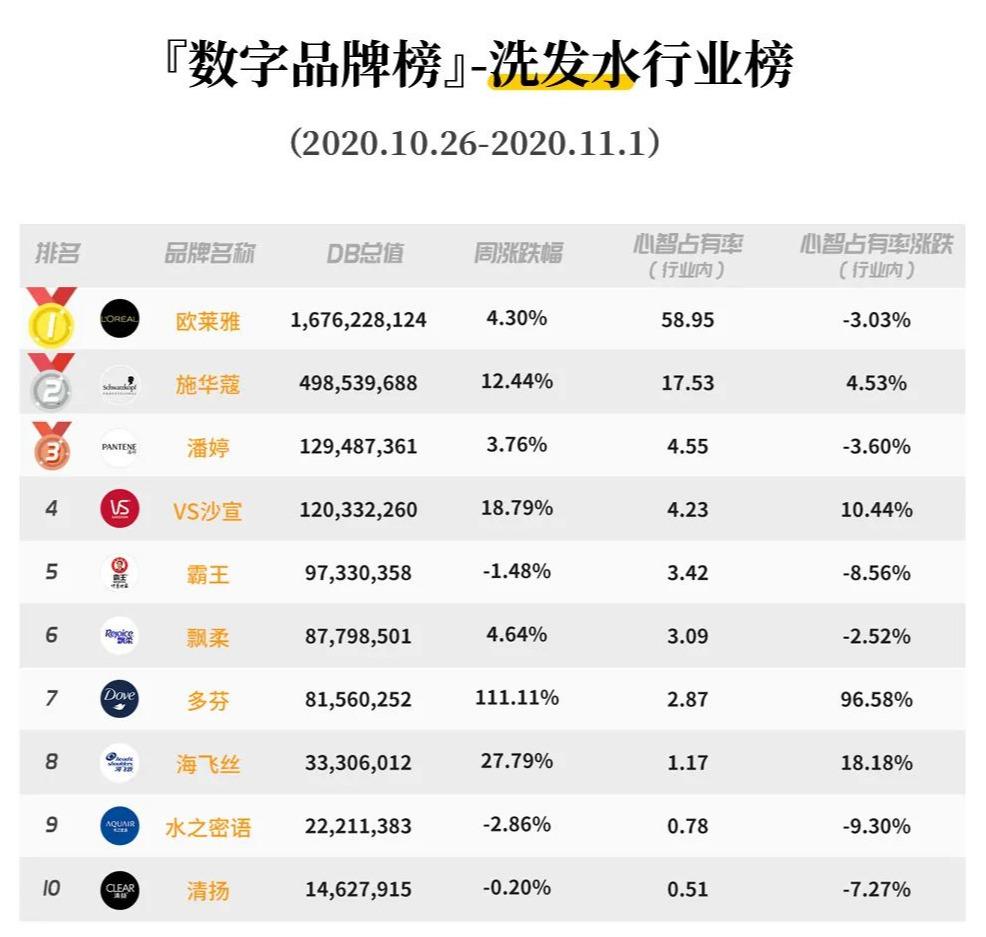 除了海飞丝的亮眼表现外,欧莱雅、施华蔻、潘婷、霸王等品牌的也在激烈的双十一中保持住了一贯优势。在『数字品牌榜』行业榜的周榜中欧莱雅,施华蔻、潘婷、霸王紧随其后,其中施华蔻的心智占有率涨幅大为4.53%。