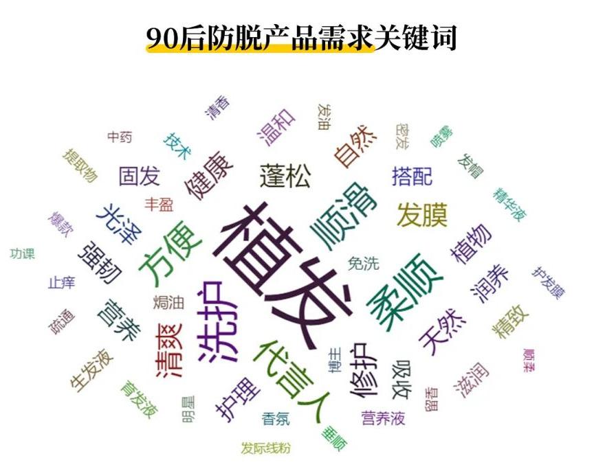 刨除植发这一硬需求外,90后的需求还集中在“洗护”“护理”“发膜”等日常防脱产品上,他们更青睐具有“天然”“健康”“固发”“方便”“顺滑”等特点的产品。