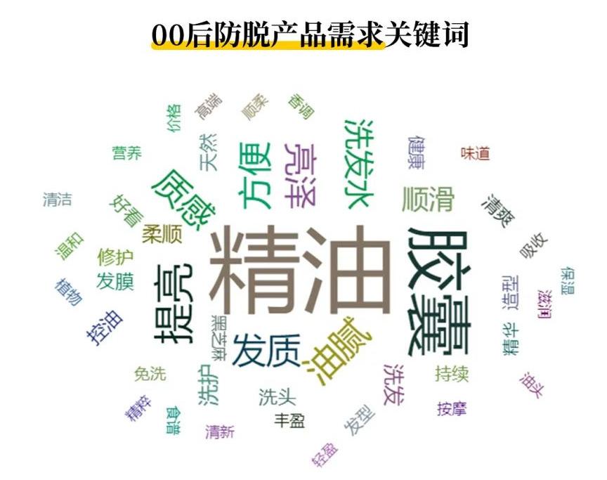 比起90后的防脱刚需,00后的防脱需求则会温和很多。从我们监测的00后防脱产品需求词云图能够看到,受00后喜爱的防脱产品是“精油”“胶囊”“洗发水”等日常护发产品。此外,比起90后对于产品的修护需求而言,00后更注重产品体验感,“质感”“味道”“清爽”是他们的主要诉求。当然90后和00后也有一些相似点,在养生越来越年轻化的当下,产品的“天然”“健康”特性也成为影响他们消费行为的因素之一。