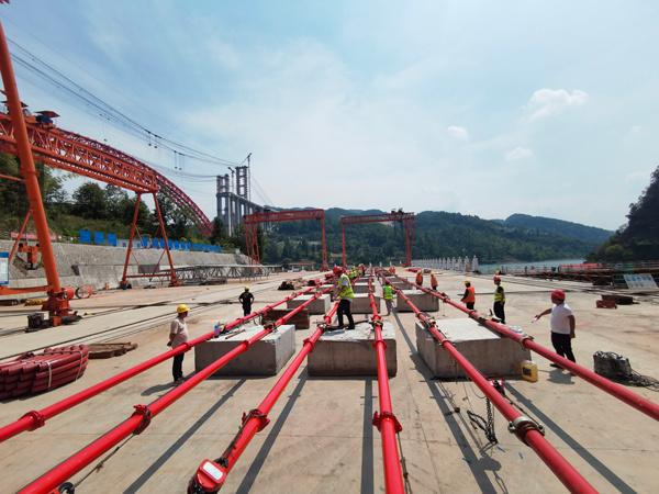 图为乌江特大桥钢管拱混凝土试验拱施工。