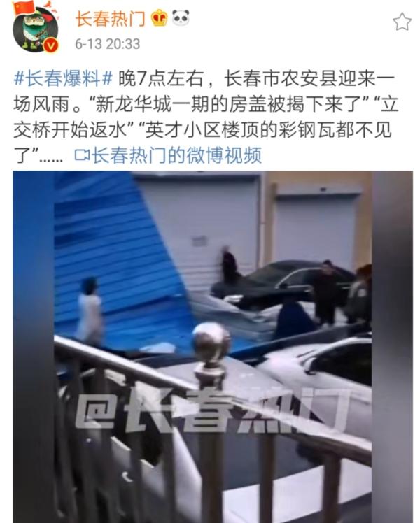 微博网友发布内容:昨晚7点左右,长春农安迎来了一场风雨。新龙华城一期的房盖被揭了下来、立交桥开始返水、英才小区楼顶的彩钢瓦都不见了…… 从网友发布的一段视频可以看出,一场雨过后,楼房顶部用于防水的蓝色彩钢瓦砸在了地面的几辆车上,车被砸变形。据现场的一居民介绍,是大风将彩钢瓦吹下来的,当时挺吓人的。有居民家的窗户也被大风吹变形。同时,也有彩钢瓦被吹在了树上。有树被风吹倒,很多树枝也被吹下,散落一地,也影响了居民出行。就连高压线也被吹倒。