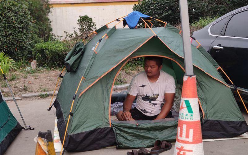 6月12日一早,山东济宁高速出口的加油站,吴瑞瑞搭帐篷睡了一宿。新京报记者 王巍 摄
