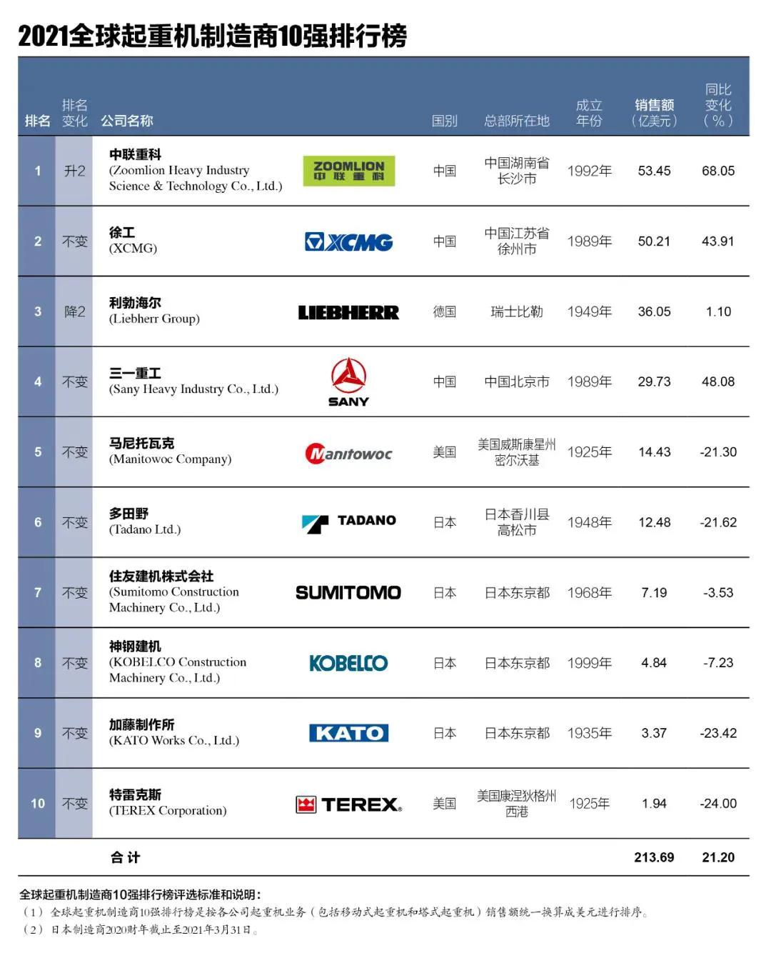 11月15日,《中国工程机械》杂志发布2021起重机制造商10强排行榜(包含移动式起重机与塔式起重机)。榜单显示,中联重科以53.45亿美元的起重机销售额位居第一,同比增长68.05%。相比上届榜单提升2个名次,升至榜首。这也是起重机制造商10强榜单发布以来,由中国制造企业“夺冠”,既充分彰显了中联重科起重机冠顶的卓越实力,也见证了中联重科引领中国起重机强势崛起的澎湃活力。