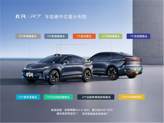 飞凡R7的RISING PILOT全融合高阶智驾系统,拥有33个高阶感知硬件,包括中国使用的Premium 4D成像雷达,以及多颗高清摄像头和毫米波雷达。