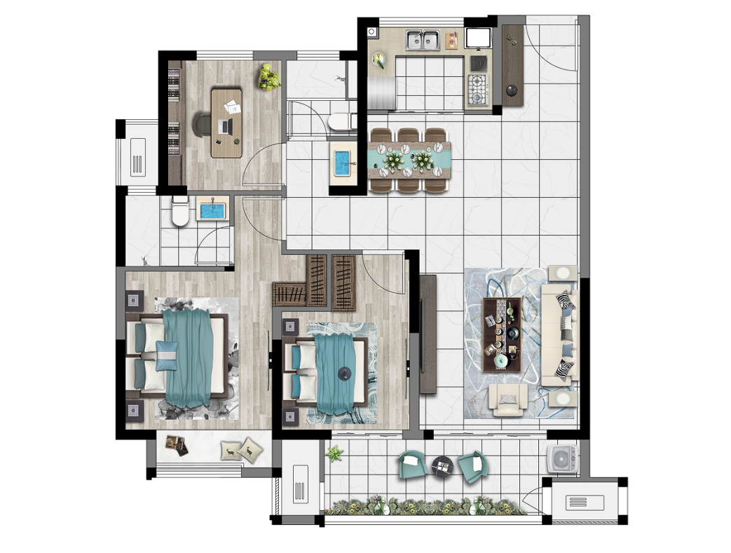 D户型选取房源为26号楼1504室,仅为装修示意图,仅供参考,本户型为毛坯交付,户型示意图,仅供参考,不作为要约或销售承诺。装修示意图中的装修、家具、陈设、户型结构、格局、功能区域等进行了适当的优化和提升,并非交付标准。客户如认可我司展示的美好示意,可在交付后按照法律政策规定进行报批报建,由客户自行改造并自担风险。具体选购房源因所处位置不同,会存在差异。不同户型的面积尺寸,功能布局,空间分割等均有不同,相同户型因标准层与非标准层、楼栋、楼层、单元等差别,局部结构、面积等也可能不同,具体情况以政府后批准之法律文件和买卖双方签订的商品房买卖合同为准。