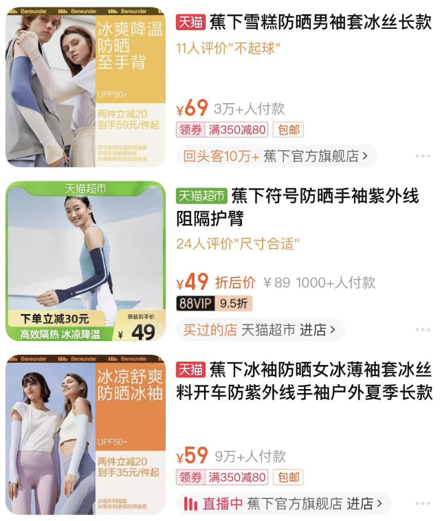 其中,蕉下的一款售价59元的连指凉感冰袖,外形看起来与价格比它低几十倍的普通冰袖无异,但因为有微压塑形、凉感冰爽的“黑科技”得到了消费者们的喜爱,月销量10w+,是旗舰店里的明星单品。