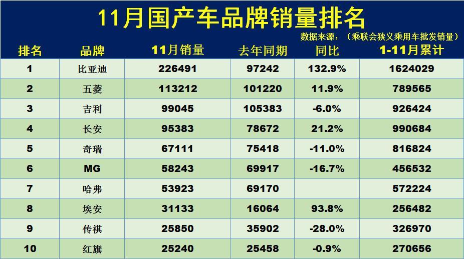 具体来看,11月份销量排名前五位的国产车品牌分别是,比亚迪汽车、五菱汽车、吉利汽车、长安汽车以及奇瑞汽车,比亚迪汽车的榜首位置依然是不可撼动,11月份再破22万辆大关,五菱汽车升至次席,11月份销量也突破了11万辆大关。三大传统国产车品牌吉利、长安和奇瑞分列三至五名,吉利和长安都在9万辆以上,而与去年同期相比,吉利汽车略有下滑,长安汽车大增20%以上,奇瑞汽车(非奇瑞集团)下滑11%左右。
