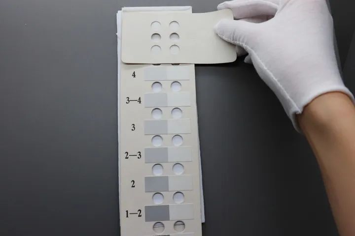 3.实验样本用符合GB/T251、ISO 105/A03标准的评定沾色用灰色样卡,在标准光源对色灯箱下进行比对等级1-5级。1级差(沾色严重),5级好(完全没有沾色)。