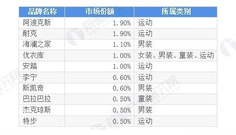 庞大服装市场背后,有许多国内外的品牌兴起。从中国服装市场品牌来看,阿迪达斯占据服装市场份额第一的位置,市场份额达到1.9%。耐克、海澜之家紧跟后面。位居前十的品牌还有优衣库、安踏、李宁、斯凯奇、巴拉巴拉、杰克琼斯以及特步。
