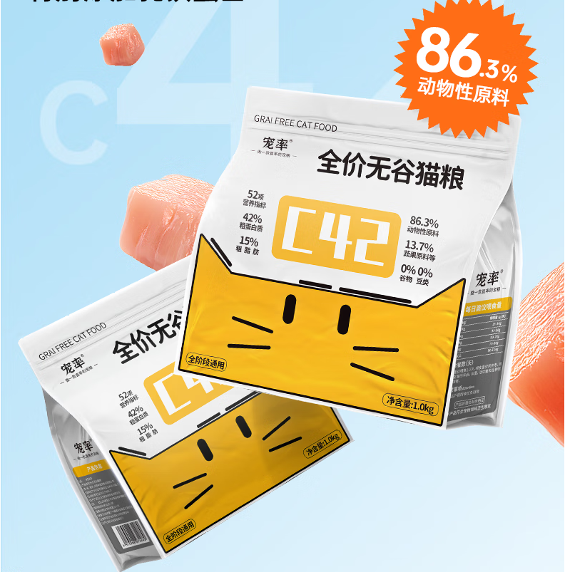 采用的是单一肉源,鲜鸡肉含量42%,含肉量高达73%,动物性原料占比也超过83%,粗蛋白含量达到43%,营养更,并且也是无谷物0添加的产品。