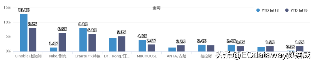学步鞋作为童鞋中的潜力品类,各大品牌纷纷发力。这也给专业童鞋品牌的发展带来一定影响,尤其是作为功能鞋品牌基诺浦、江博士等。数据显示,2019年,全网热卖品牌是基诺浦,但是相较于2018年同期,销售额占比下降了4.9%,众所周知,基诺浦是专业做童鞋出身,主打功能鞋,所以学步鞋是其一个重要的品类版块;另外,国外品牌耐克在全品类中,近两年也开始在学步鞋发力,从增速上来看,可见一斑,销售额占比从1.4%增长到6.5%。一方面,阿里电商的红利向国外品牌倾斜,另一方面,国外品牌意识到中国市场的重要性,在营销上频频发力,同时降低单价,吸引了许多消费者。