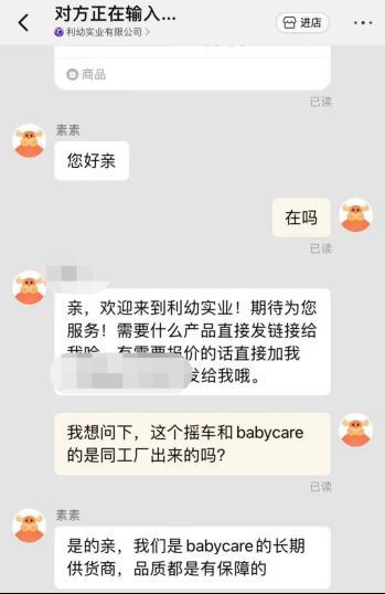 1688上与Babycare玩具供应商聊天截图