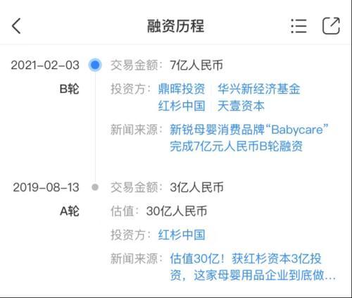 截至目前,Babycare共获得两轮融资。2019年8月,Babycare获得由红杉中国投资的3亿元A轮融资,随后估值达到30亿元;去年2月,它又获得由鼎晖投资、华兴新经济基金等联合投资的7亿元B轮融资,估值再次被拉高。