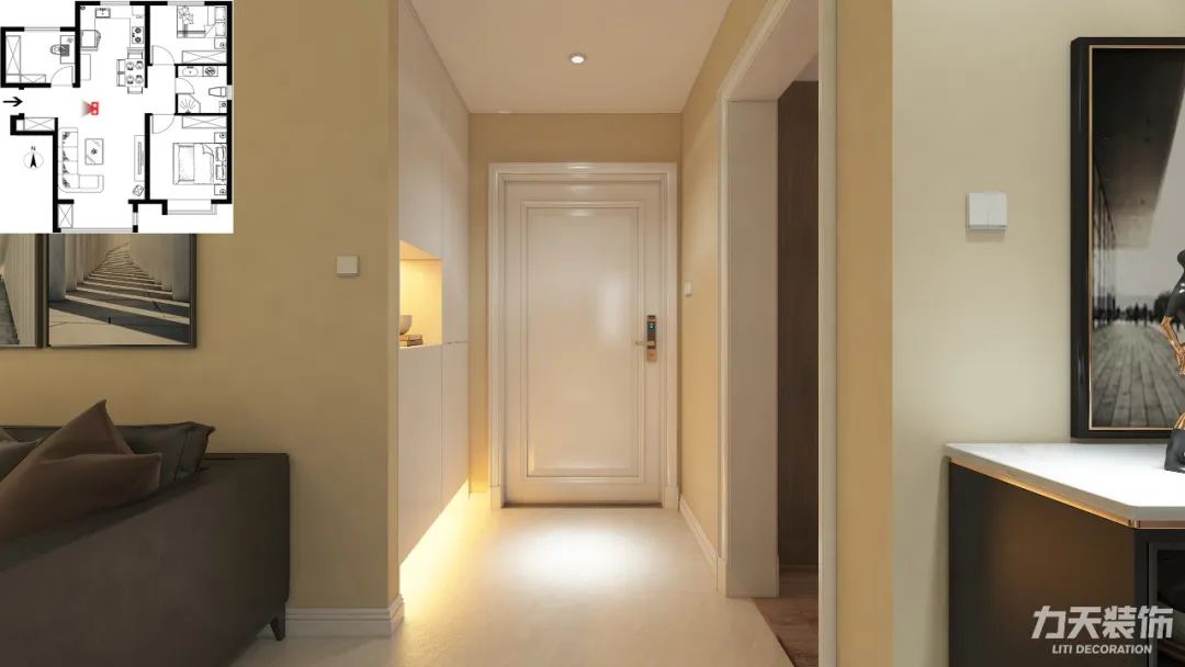 门厅选用一排到顶的玄关柜,节省空间的同时增大储物面积;简洁的墙面处理方式及装饰陈设,兼顾实用和美观。