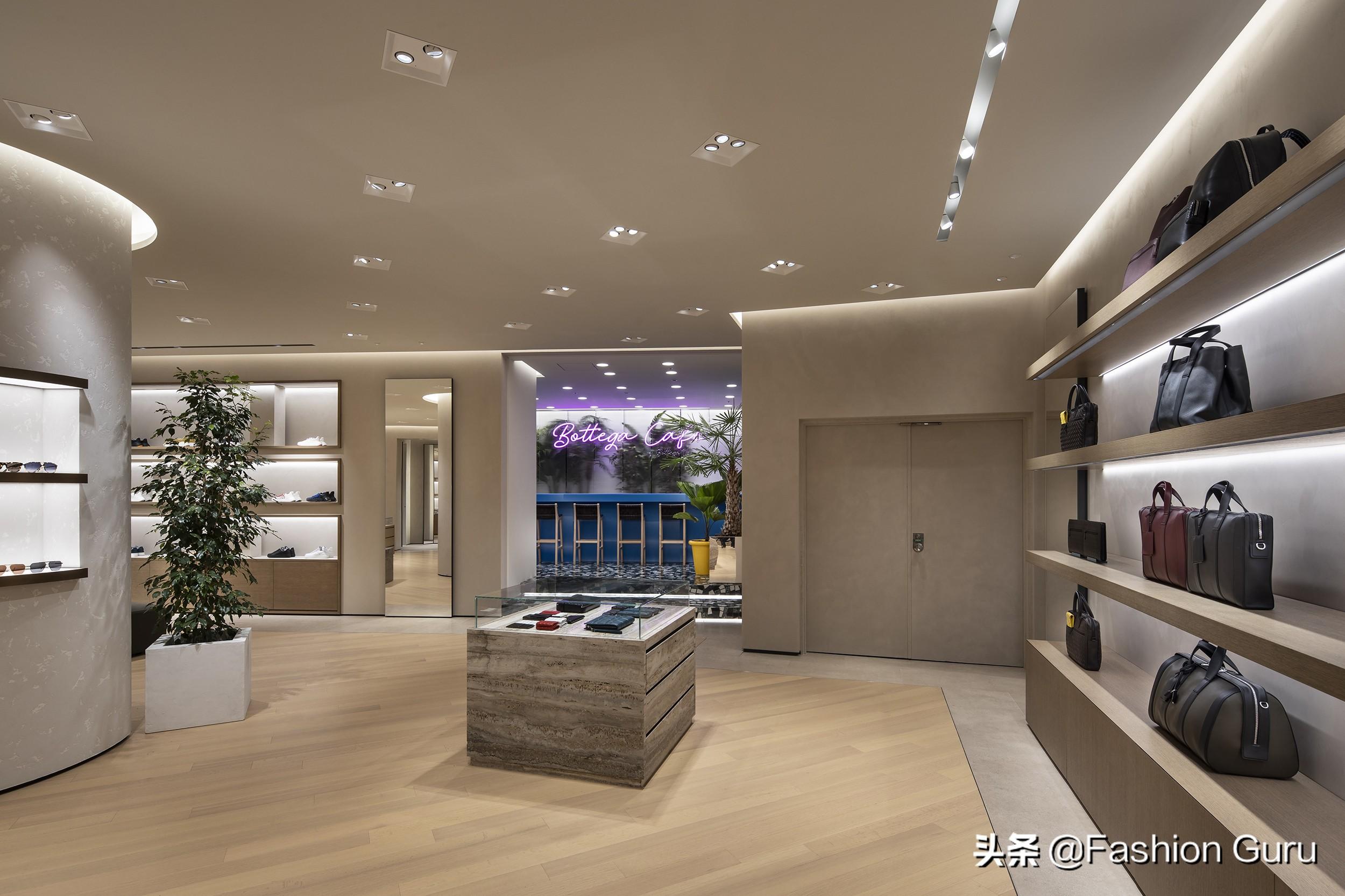 整个空间周围摆放着宽大的弧形胶合板长椅,阳光透过大面积的棱纹玻璃窗投射进来。餐厅以深绿色和黑色地板为主打色调,Bottega蓝的餐桌和吧台点缀其间。奢华咖啡色皮革和优雅的木质座椅契合了品牌标志性的intrecciato编织图案。
