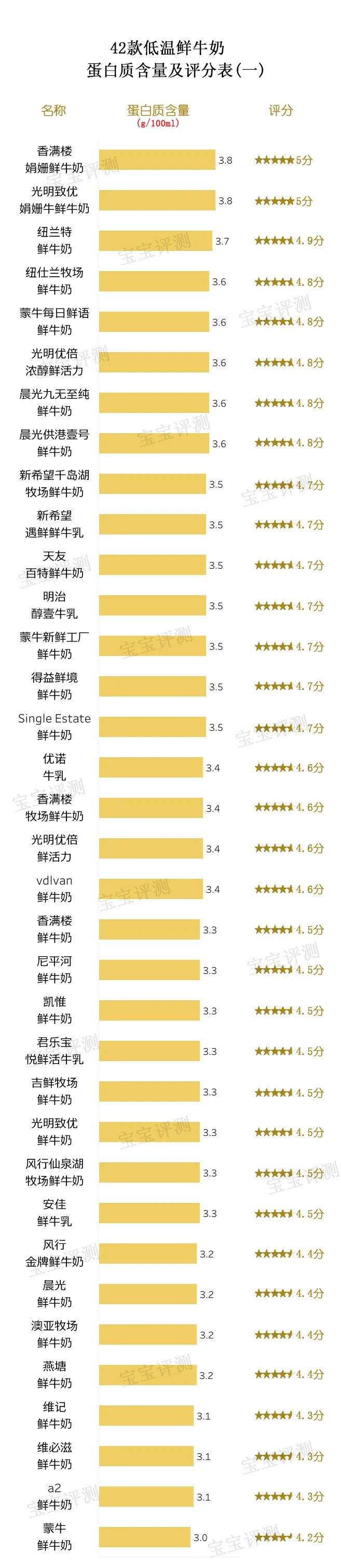 2、表(一)的35款鲜牛奶中,香满楼娟姗鲜牛奶、光明致优娟姗牛鲜牛奶的蛋白质含量并列第一,达3.8g/100ml。低的是蒙牛鲜牛奶,蛋白质含量为3.0g/100ml。