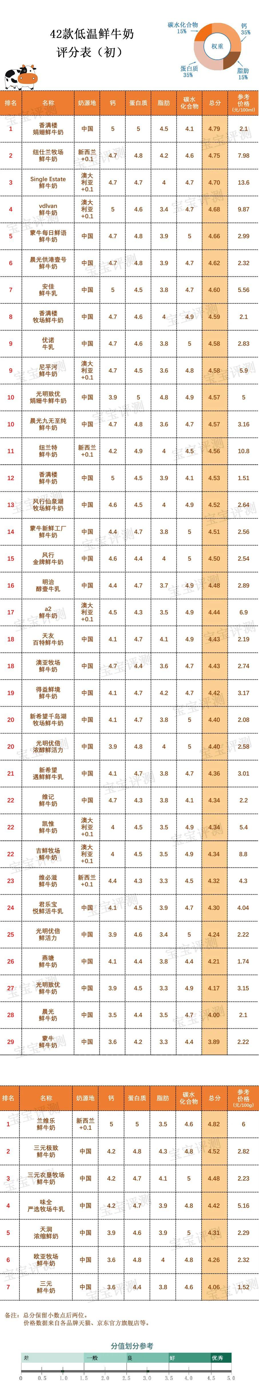 仅从营养成分表标识来看,42款低温鲜牛奶营养价值的终得分及排名情况如下: