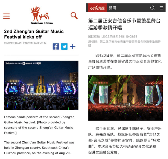 本次音乐节得到了央级、省市、互联网媒体以及微博大V的大力宣传,全网热度4000万+,知乎20余个城市站通过城市定向焦点图,推送「正安吉他音乐节」,让全国网友通过知乎,了解正安,传播正安,助力「吉他之都·音乐之城」登上知乎热榜,「正安吉他音乐节」成为当晚全国知友热议话题。贵州省政府网英文版发布了正安吉他音乐节成功举办的消息,将「正安吉他音乐节」IP向海外传播,让更多的人关注正安吉他产业发展。