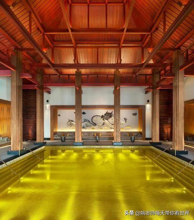 拉萨瑞吉酒店还有着世界上的金色能量泳池,整个泳池底部由金箔小马赛克铺成,畅游于此仿如置身黄金海洋。