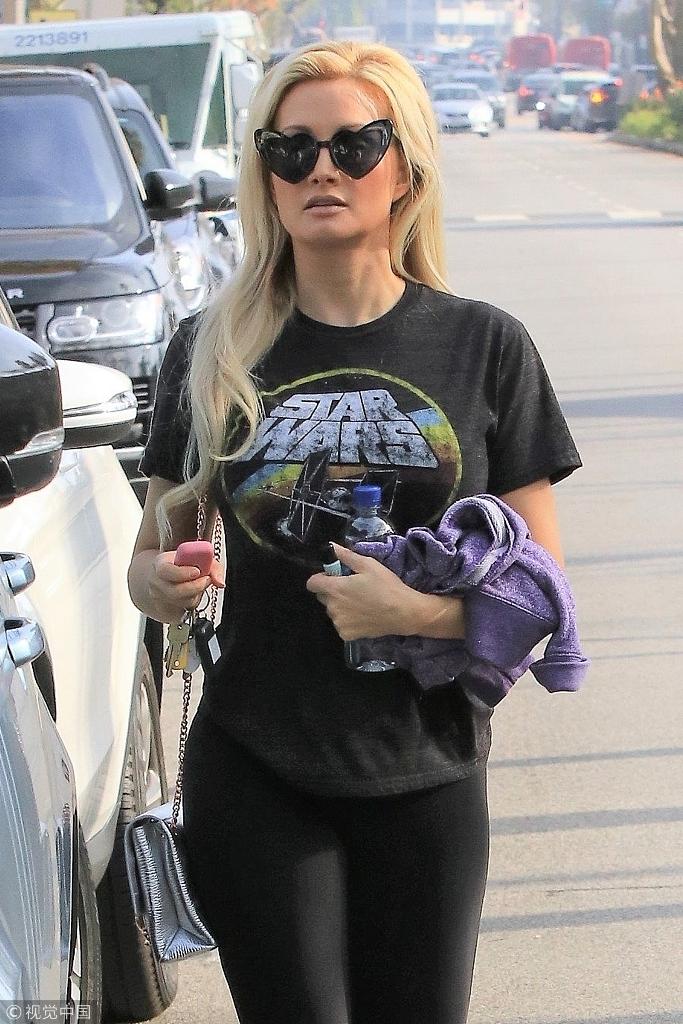 霍莉·麦迪森(Holly Madison)穿“星球大战”T恤,戴爱心形状眼镜,舒适中见潮味。图片来源/视觉中国
