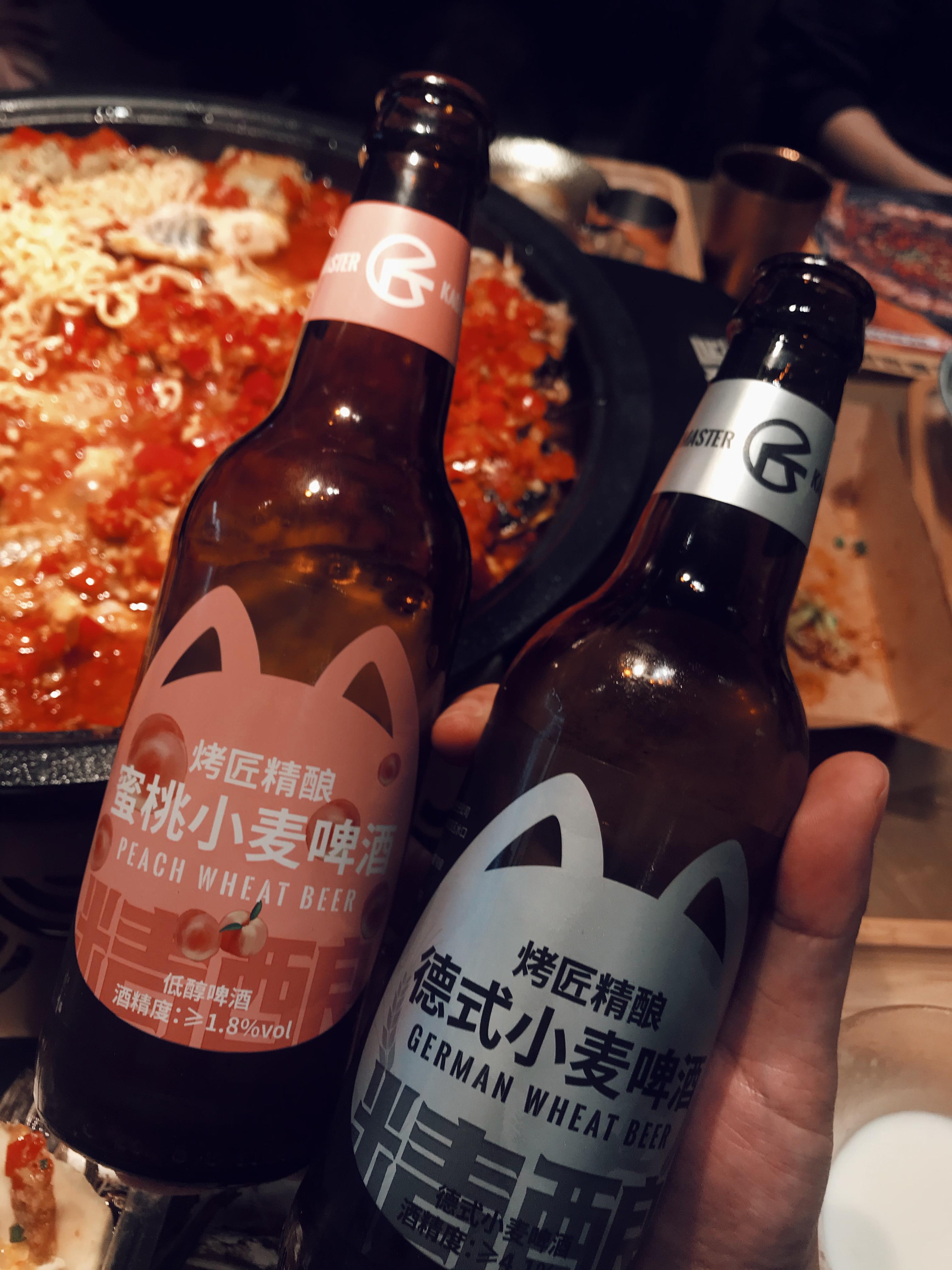 烤匠的酒也是品牌用心开发的产品,毫不敷衍,自家精酿小麦啤酒,蜜桃味和原味都好喝,特别清新,基本没有酒的苦味,男女老少····少还是算了,男女老都可以喝点。