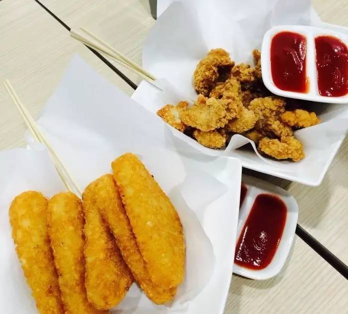与一般茶饮店的不同是,店内还提供多种小食、炸物,比如薯饼、炸水饺、洋葱圈、公仔面。