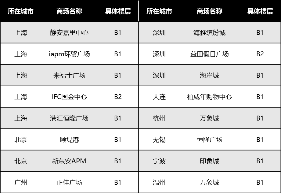 品牌陆续进驻一些中的购物中心,比如上海的环贸广场、国金中心、来福士广场等,发展到北京、深圳、广州、宁波、无锡、大连等多个城市,有40余家门店。