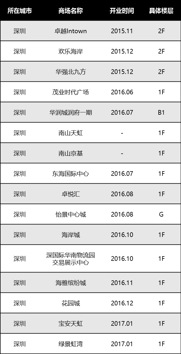 直到2015年12月,在深圳开了第一家海岸城店。(其实店铺位于与海岸城二层露台相连的天利名城项目)