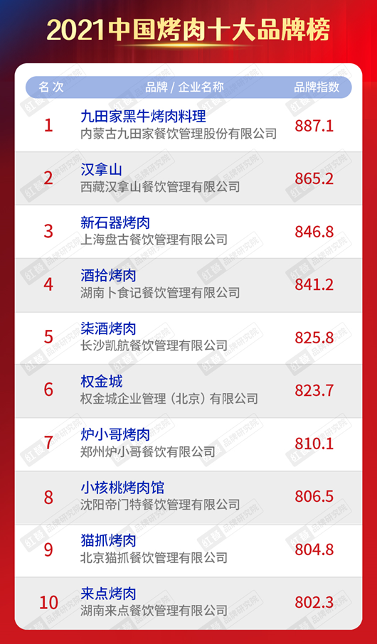 烧烤品类近年来的关注度一直在攀升,烧烤品牌的实力整体提升不少。从品牌的排名来看,木屋烧烤和很久以前羊肉串稳踞前两位。2021年,烧烤尤其是中式烤肉品类的热度高,涌现出了以九田家、柒酒烤肉等优质品牌。烤鱼品类近年来的表现还是有些平淡,整体没有特别大的变化,老大哥探鱼还是稳坐的宝座。而在“2021年中国酸菜鱼品类十大品牌”中,太二凭借雄厚的品牌实力拔得头筹。