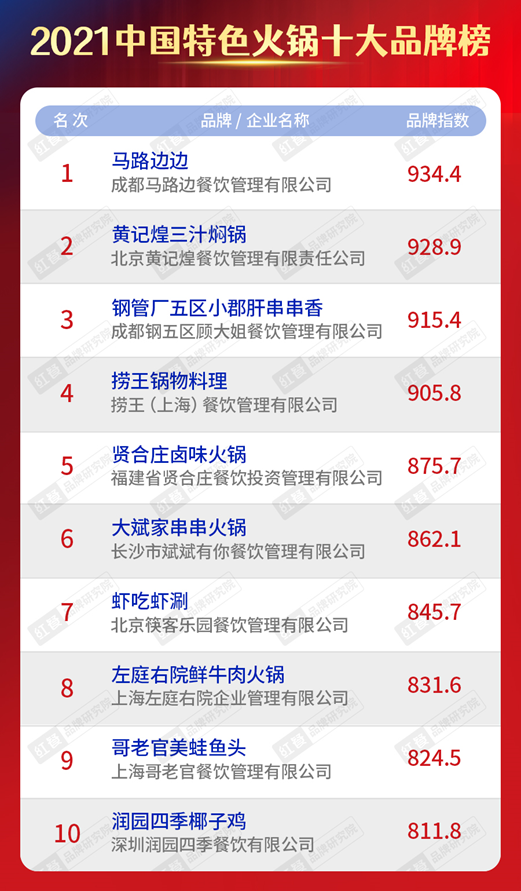 今年新推出“2021中国特色火锅十大品牌”奖项,马路边边、钢管厂五区小郡肝串串香、润园四季椰子鸡等10个品牌上榜。这些品牌均在各自的细分赛道中表现出色,可谓品牌进行细分化探索的范本。