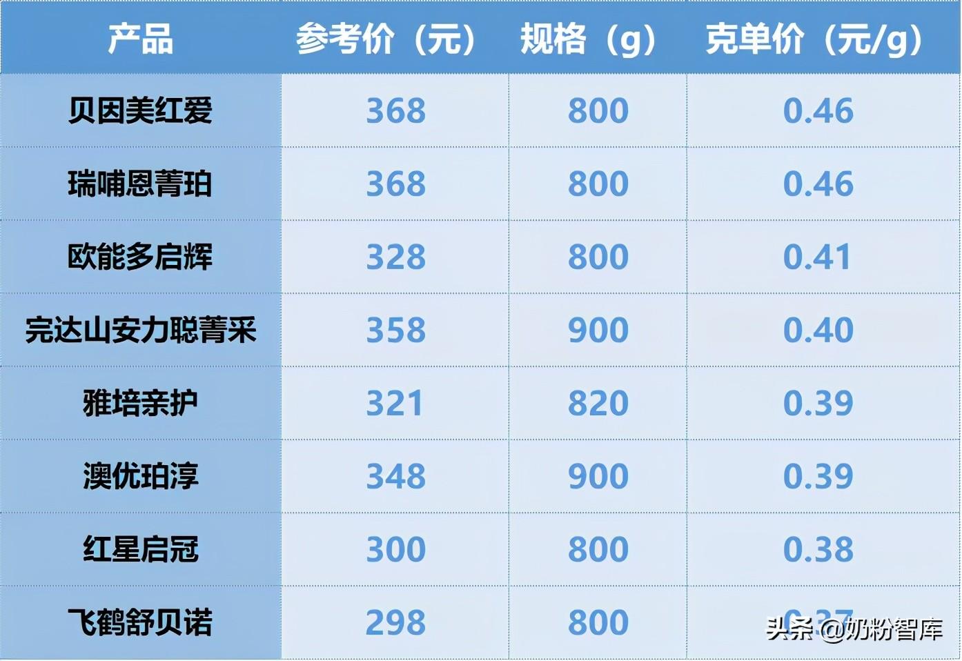 小结:从上述8款奶粉的克单价来看,贝因美红爱、瑞哺恩菁珀、欧能多启辉和完达山安力聪菁采的价格较高,克单价在0.4元/g及以上;雅培亲护、澳优珀淳、红星启冠和飞鹤舒贝诺的价格适中,克单价在0.3-0.4元/g之间。