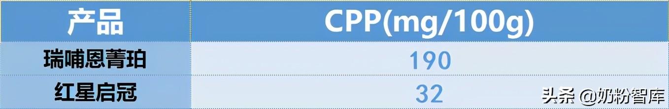 本次评测的8款奶粉中有2款添加了CPP,其中瑞哺恩菁珀含量比较。