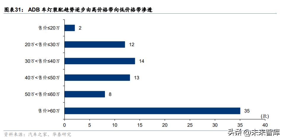 ADB 车灯装配趋势逐步由高价格带向低价格带渗透。以近两年上市的装配 ADB 大灯的 84 款车型作为统计样本,35 款车型为售价 60 万元以上的豪华车,占比 42%,仍然为 ADB 装配主流的车型。售价 20 万元~60 万元的车型包括部分豪华车及日系、德系高端车, 配置 ADB 车型数量达 47 款,占比达 56%。售价 20 万元以下的,为积极做出 ADB 配置 尝试的国产自主品牌。