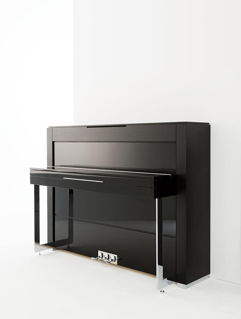 镀铬的覆层,三角钢琴技术“Double Repetition Action”(“双重复振功能击弦机”) ,弱音踏板(倍弱音踏板),锥形可调节高度的琴脚,Pure Noble 有黑色和白色高光可供选择。