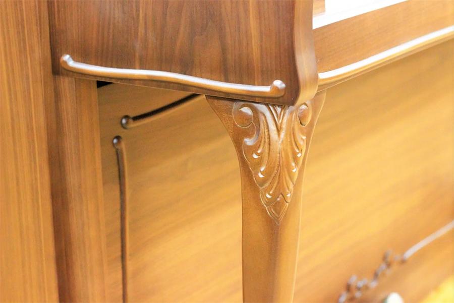 这款三角钢琴具有令人惊叹的优美外观和富有情感的装饰——经匠人手工精工制作的木质镶嵌物以及手工雕花的八角切割的琴腿,且音色明快而清澈。