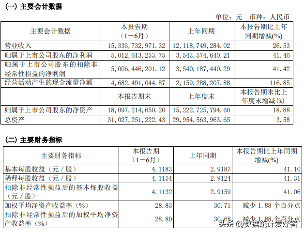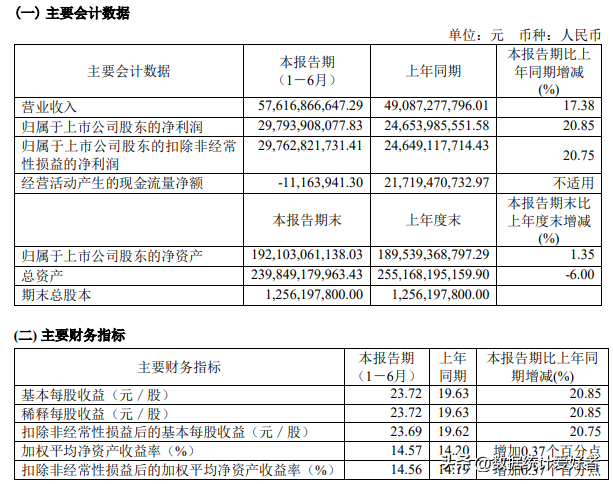 上半年,公司实现营业收入 189.08 亿元,同比增长 21.65%;归属于上市公 司股东的净利润 68.93 亿元,同比增长 21.76%;归属于上市公司股东的扣除非经常性损益的净利润 66.43 亿元,同比增 长 28.54%。