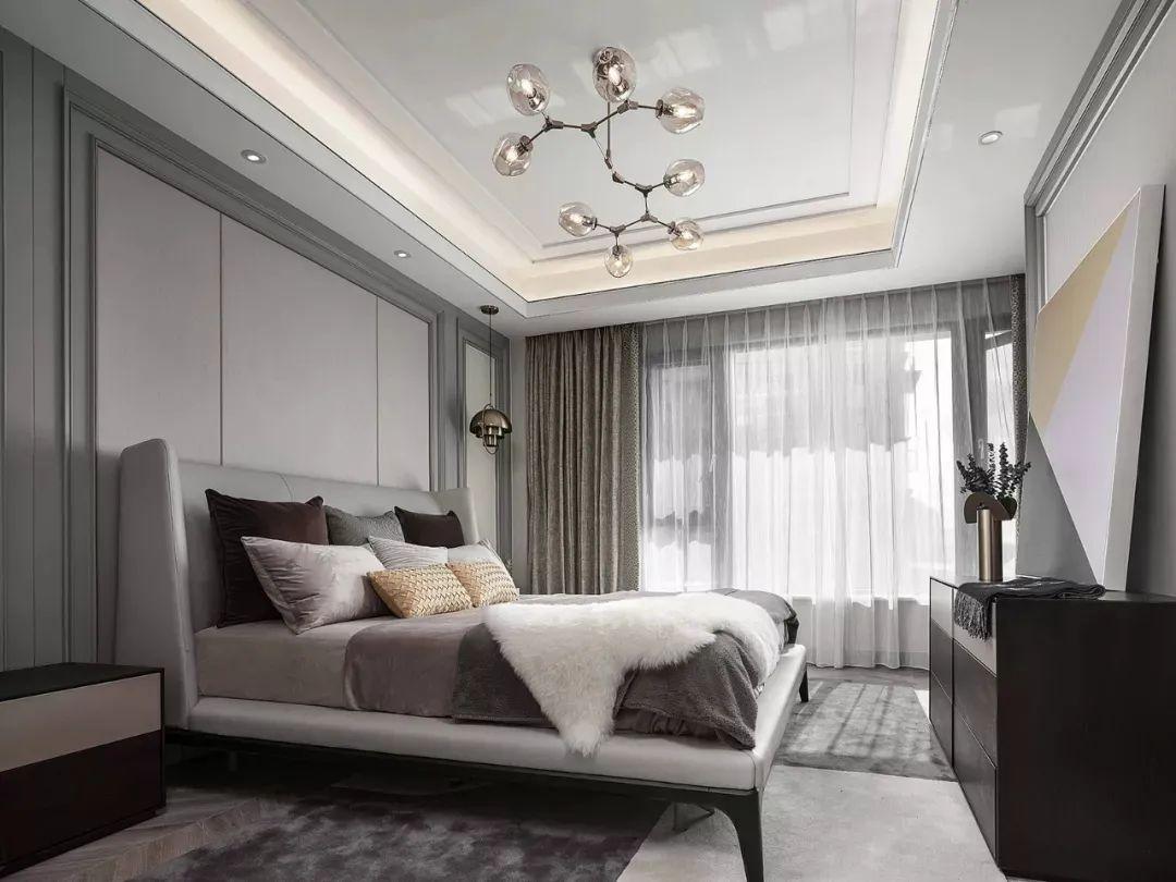 ▲灰色调的卧室空间,天花采取无主灯的设计,布置上一张深灰色皮艺床+米白色床单,再加上灰色的窗帘,使得卧室空间简约舒适而大方,床尾处摆上一个黑色斗柜,柜台上房子黑白配的装饰画与花瓶,也让卧室显得简约高级。