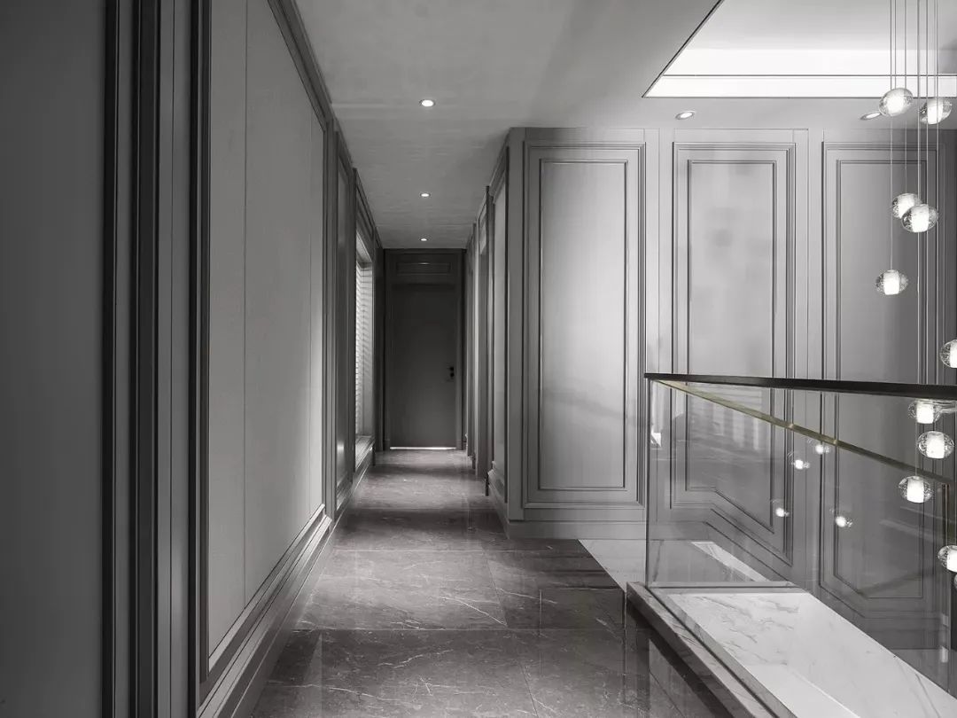▲上了楼梯,灰色的楼道地面、墙面,墙面是灰色护墙板的设计,天花吊平顶+筒灯组合,让楼道空间也充满简约高级的设计感。