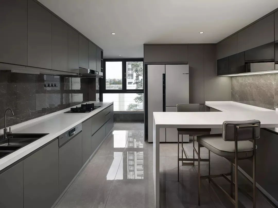 ▲厨房以灰色的墙面地面空间、定制橱柜的硬装,搭配白色的操作台,并且还在厨房里面中岛台+吧椅的组合设计,为主人提供了一个华丽精致的厨房环境。