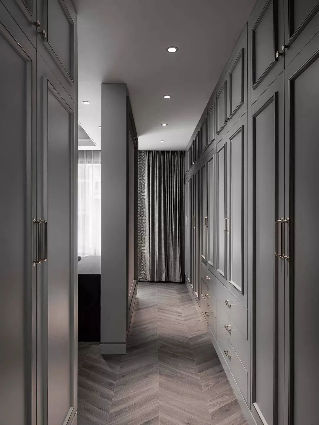 ▲衣帽间在床尾墙后方,整体空间以灰色欧式的衣柜设计,搭配上金属质感的拉手,木地板采取鱼骨拼的铺贴,使得空间也是显得更加华丽档次。