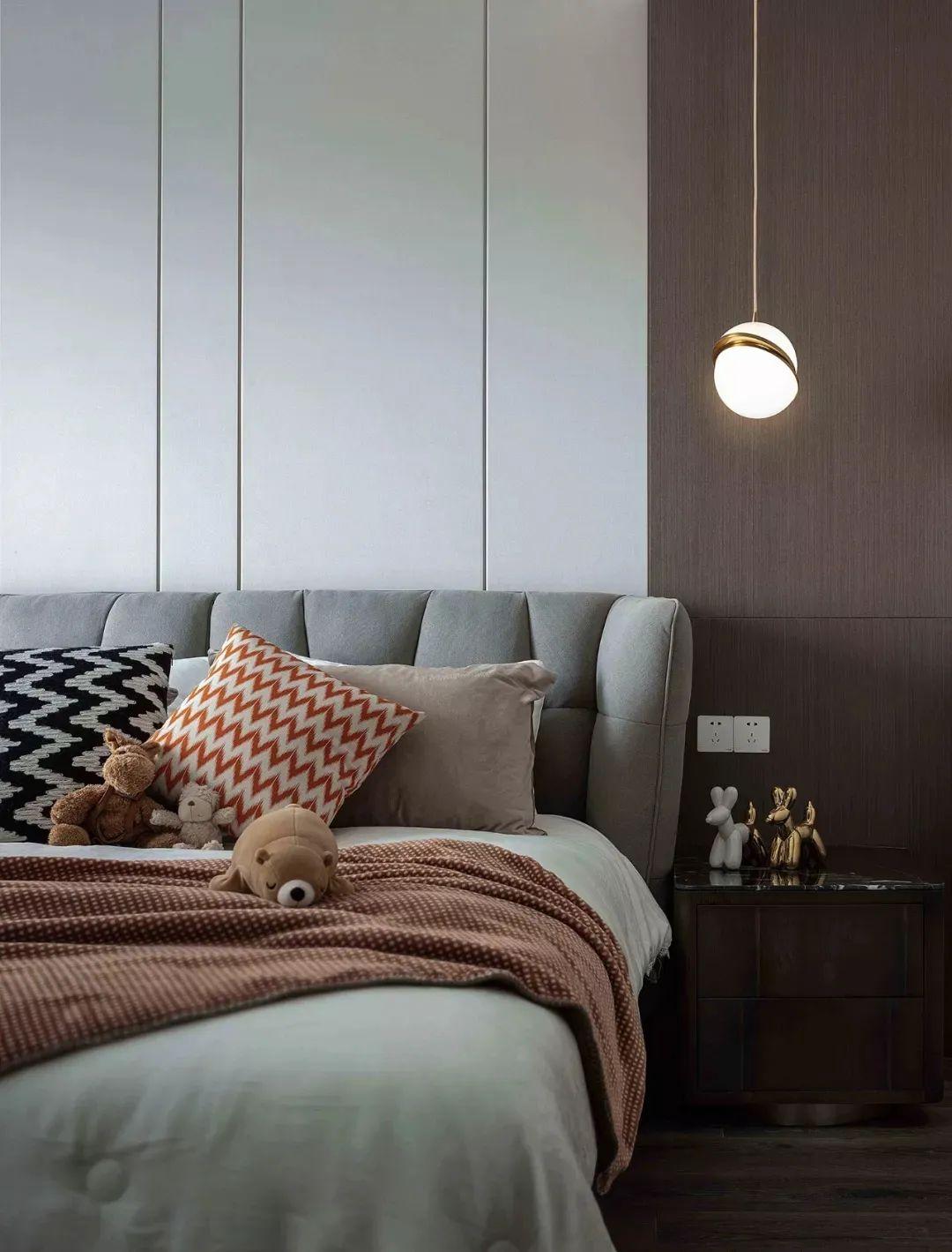 ▲主人卧室以中间灰色硬包+两侧护墙板的设计组合,布置上一张灰色皮艺沙发组合,还有紫灰色的床单布置,床尾摆一个黑色斗柜,带来一个简洁优雅的卧室氛围。